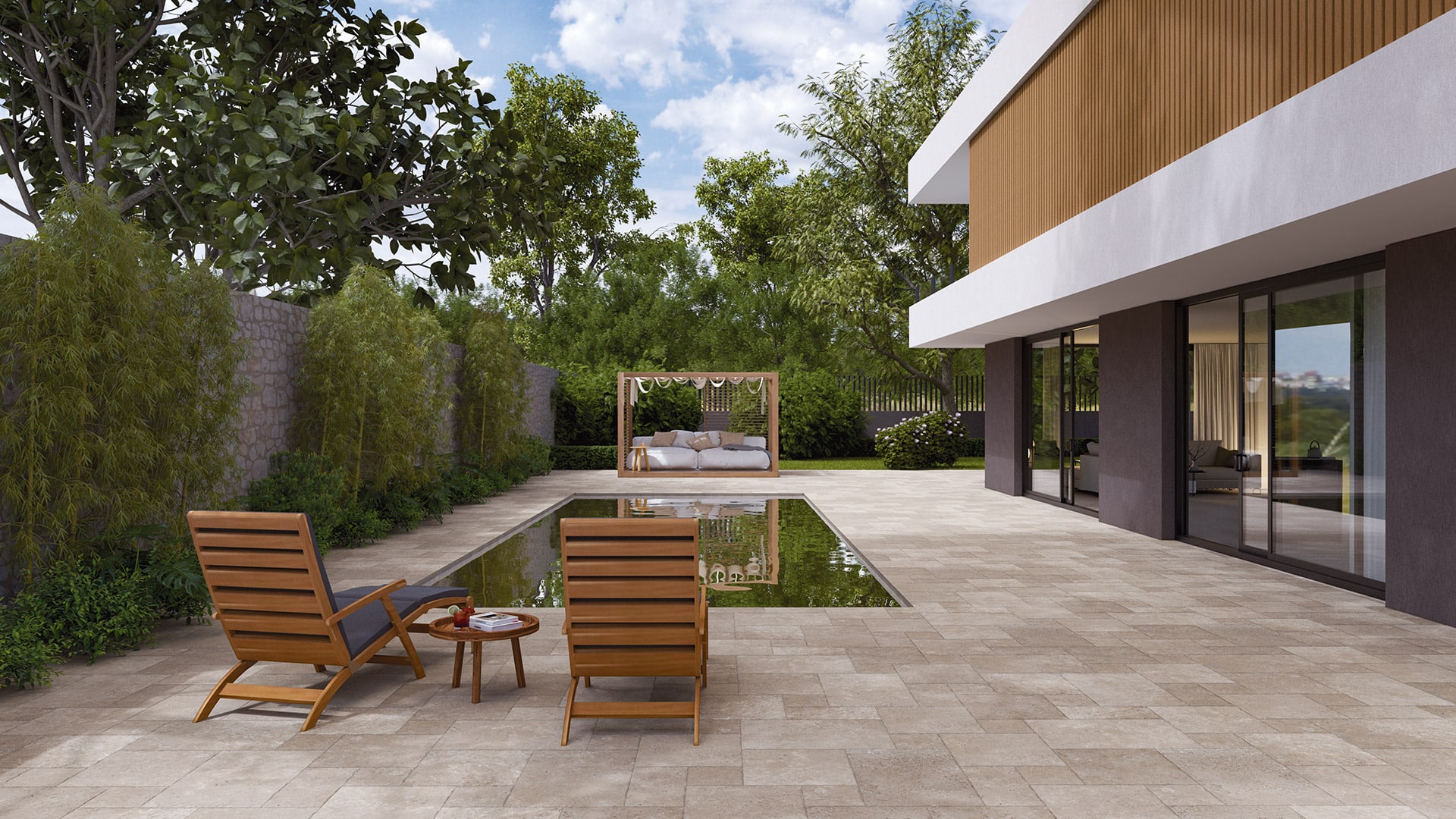 European alfresco styling is only a step away when you consider the Ostuni natural stone marble, French pattern tile. With a textured weathered surface and a structured finish this tile is perfect as an alternative for outdoor pavers, in a modular French pattern.